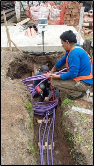 Tendidos tanto soterrado, como por las cañerías de cables de control de 25×2,5mm2 y cables de Alimentación, tipo Sintenax de 2×25 mm2 para Alimentar los Gabinetes alado de las vías de 2,20×1,20×1,00 mts., Galvanizados en caliente. Y tendidos de Cables para los circuitos de vías Tx/Rx son cables tipo Sintenax de 2×16 mm2. Tendido entre cañerías y soterrados de 35.000 metros de cable.